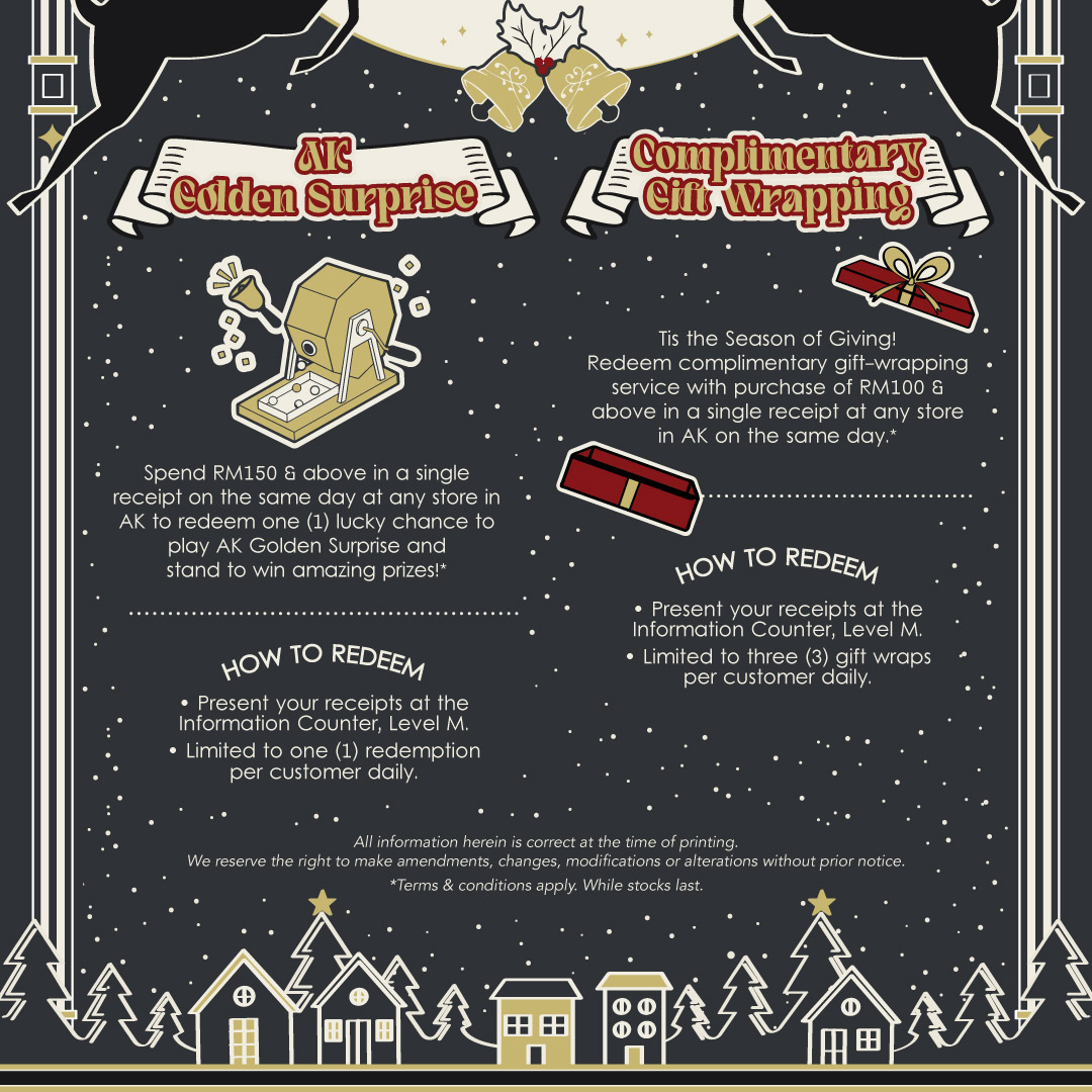 Spend RM150 & above in a single same-day receipt at any AK store to redeem one (1) chance to play the AK Golden Surprise game and stand a chance to win exciting prizes!